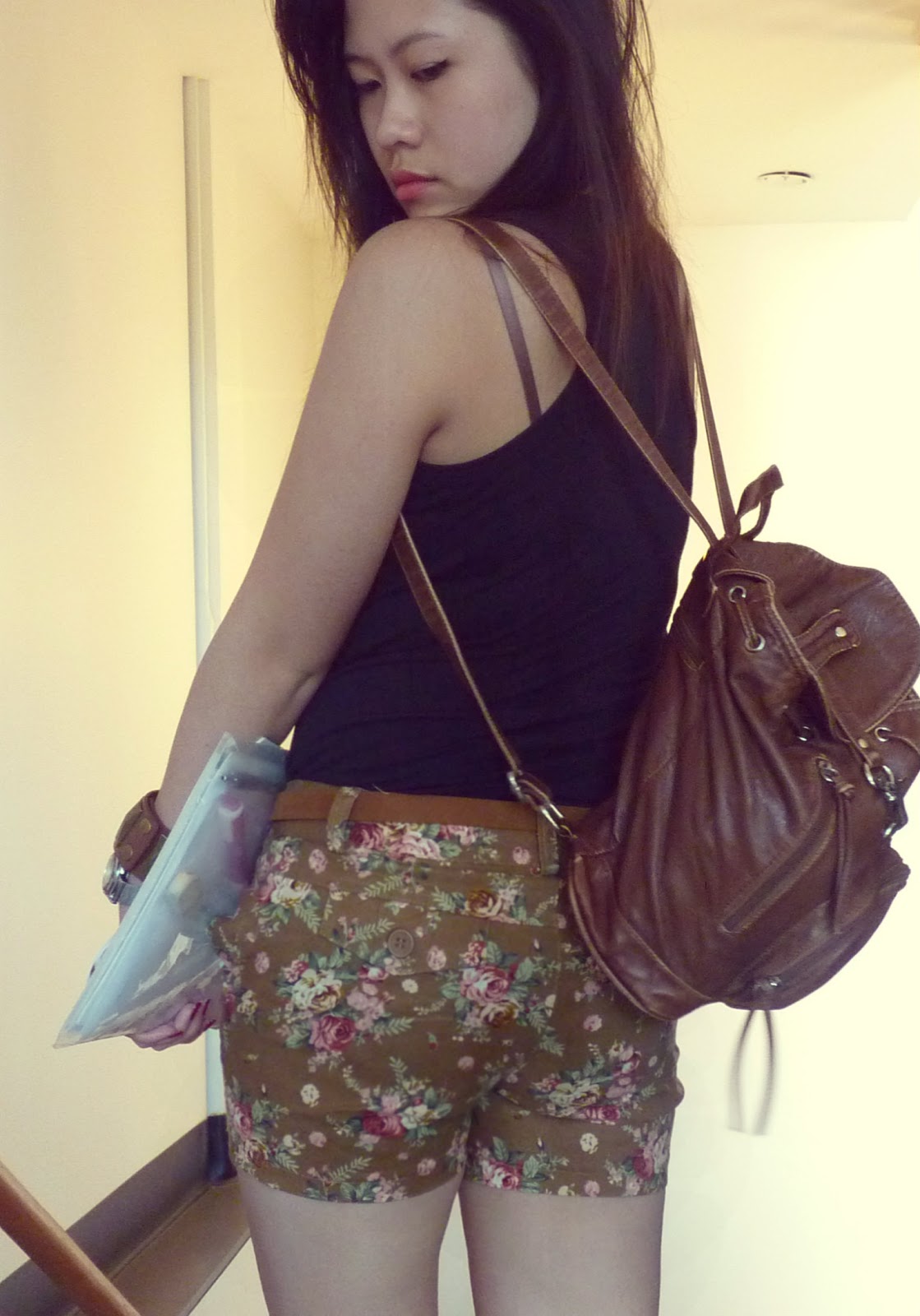 Deciding to hit the casual preppy note for the day, I went with a colour-blocked scheme of white, brown and black, all in the good name of Earthly tones. And because the top was so simple and plain, I was able to add a subtle emphasis through a pair of faded floral vintage trousers and studded clogs that worked wonders in silently stealing the show, whilst tying this whole outfit together.